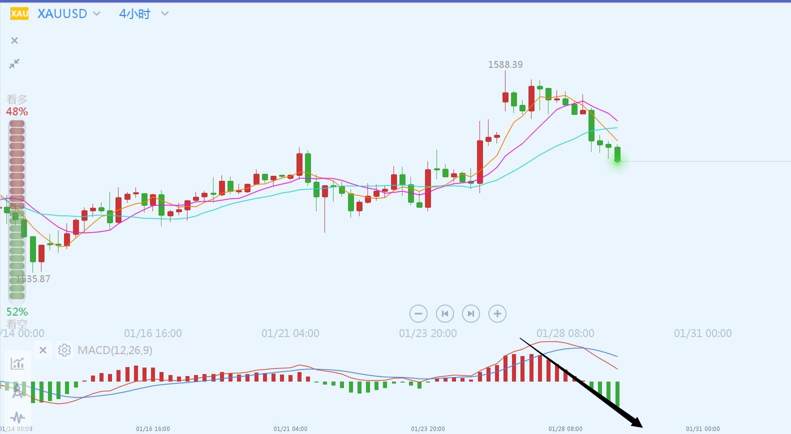 文/胡永润 不要患得患失,风险与机遇并存,当你做好了准备迎接机遇的时候,就要想到未来将要面对的风险,没有什么事情可以一帆风顺,只有拼尽全力努力改变被动局面,才有可能扭转乾坤。 黄金和上周一样,跳空高开5美金,目前已经回补缺口。日线级别黄金多头趋势不变,5、10、20日均线金叉上行。4小时级别,黄金在上周关键压力位1585受到暂时的支撑,短期顶部形成黄昏星形态。小时线级别,跌破短期支撑线,MACD指标红柱收缩,短线有继续下跌趋势。 今日操作的重点就是要确认黄金是会延续早间的强势多头行情,还是走冲高回落。亚欧盘先观察1585附近的支撑,等待下方企稳信号,暂不急于入场。如果能在1585止跌企稳可继