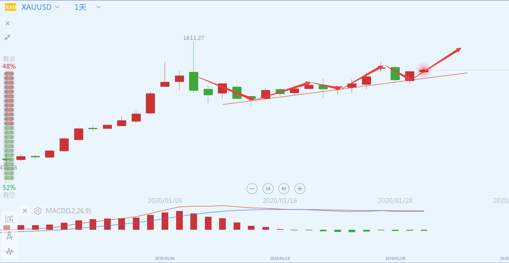 文/胡永润 “今天天气很好,在房间待久了,准备去客厅散散心。”这句话道出了很多人现在的生活状态(包括我),2020年的这个春节因为连续多天不出门,格外怀念之前过年的热闹,主要是在家闷得慌。一年不见,走走亲戚,见见朋友,吃吃饭,聊聊天,是多年习以为常的事,现在只能呆在家确实不习惯,不过有时间在家陪陪家人也是一种幸福。 年年岁岁花相似,岁岁年年人不同,同样的市场,被不同的人经历,同样的涨跌,被不同的人感受,借取经验而不是购买经验的人才是这里最幸运的,错过,是为了更好的相遇;投资,是为了梦想的实现。 黄金受1月30日凌晨美联储利率决议影响,持续走高,下午4点开始回落,晚间价格一度下挫至1572,而