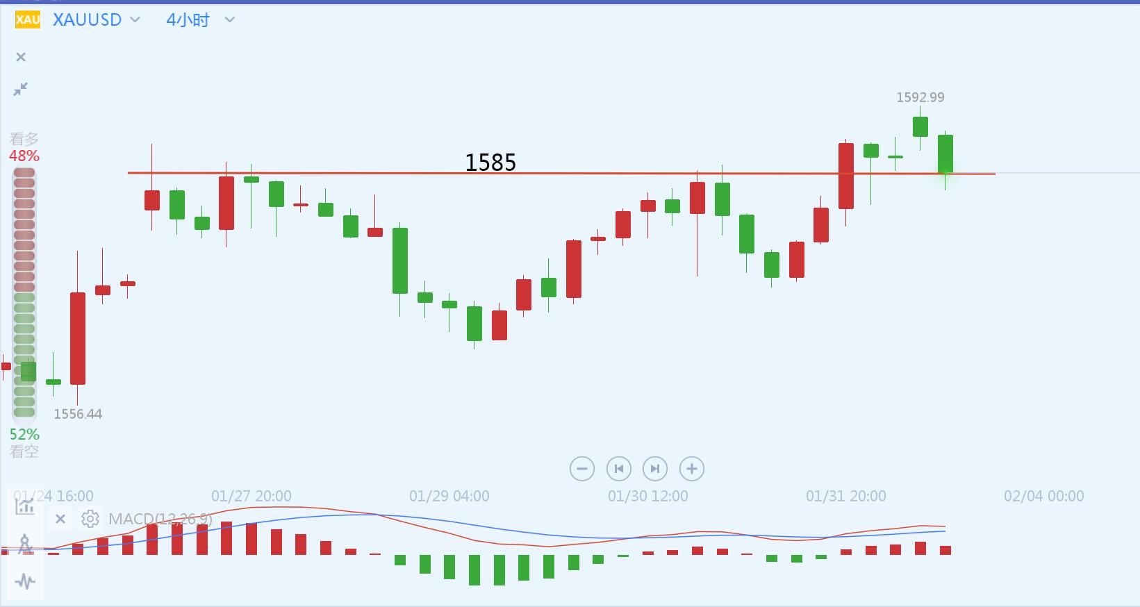 文/胡永润 黄金受凌晨美联储利率决议的影响,日内持续上涨,现在价格位于周一跳空窗口上方,小时线级别,4小时线级别,日线级别,5/10/20日均线皆为金叉上行,短线有继续上涨趋势。 现在黄金价格位于1580附近,接近前期高点,晚间对于黄金的短线操作首先要确认一个问题:黄金是继续向上突破前期高点1585,还是会承压下跌?首先表明一下自己的观点,我认为会承压下跌概率较大,依据如下: 1、目前日线级别MACD指标依旧位于0轴下方,这说明了黄金现在多头力量偏弱。 2、周一黄金跳空后价格回落,直到完全关闭窗口,我们可以把它看做是回落修正,这表明了黄金没有足够的动能维持迅猛的涨势。 3、从今日0点到现在,