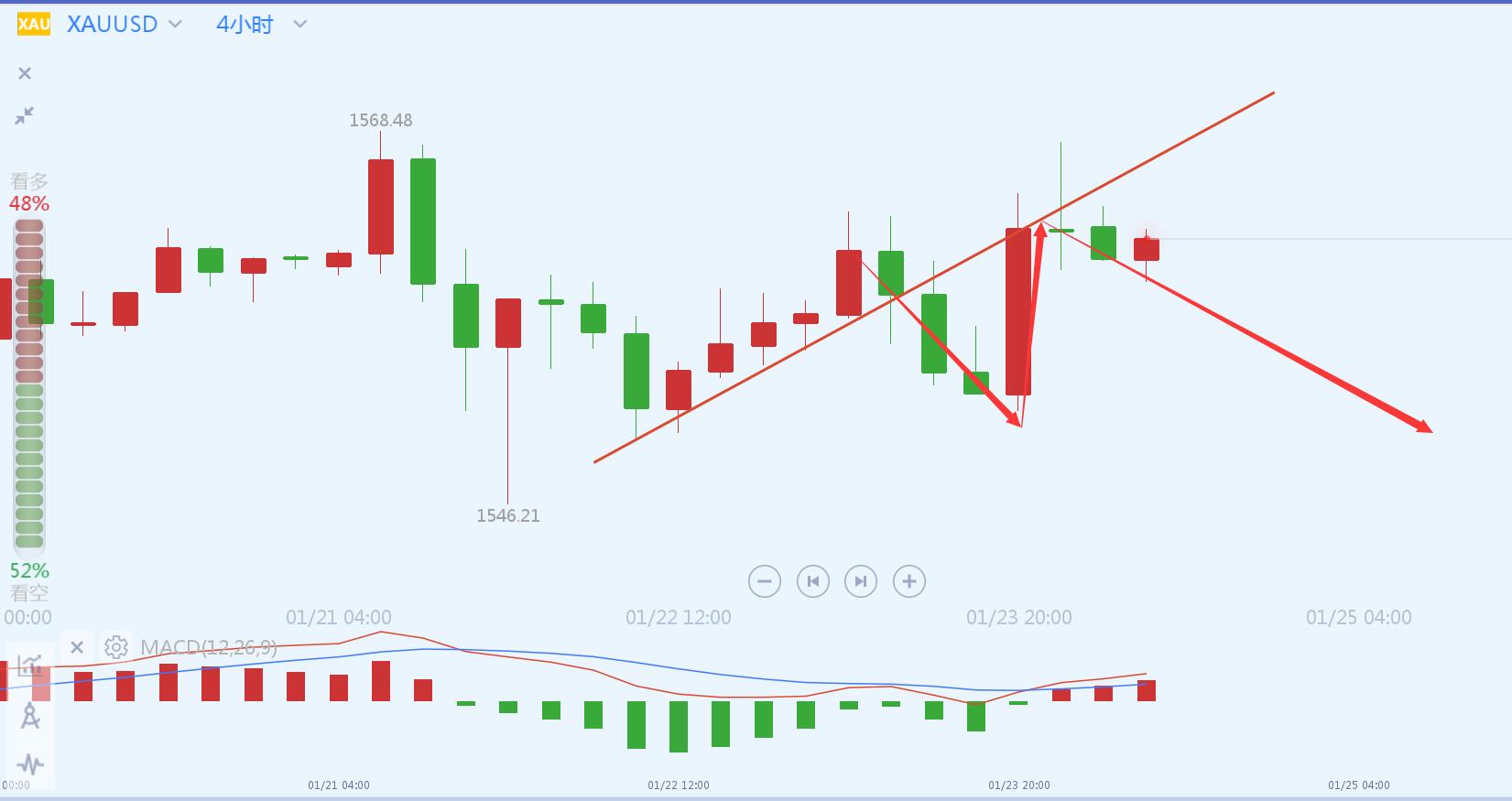 文/胡永润 昨日,美国在达沃斯世界经济论坛上发表讲话,加大对欧洲施压,再度提出汽车关税威胁,相关不确定性支撑金价,隔夜加拿大央行鸽派维稳,强化了市场对全球主要央行维持宽松立场的预期,又再度给金价提供支撑。 黄金前面一直说到,日线级别的窄幅震荡,目前还没有足够的强劲的动能令黄金突破。今日早间向上突破了上方1559压力,并未按照昨日的价格区间运行。昨日我也说到过,要警惕突破。 现在黄金4小时级别连收5根阳线,5、10日均线金叉向上,MACD指标绿柱收缩,上升支撑线完整,现在暂时在1561遇阻回落。日内有望测试前期高点1568。目前趋势依旧不延续,注意利润把握。 黄金操作建议,1558多,止损15