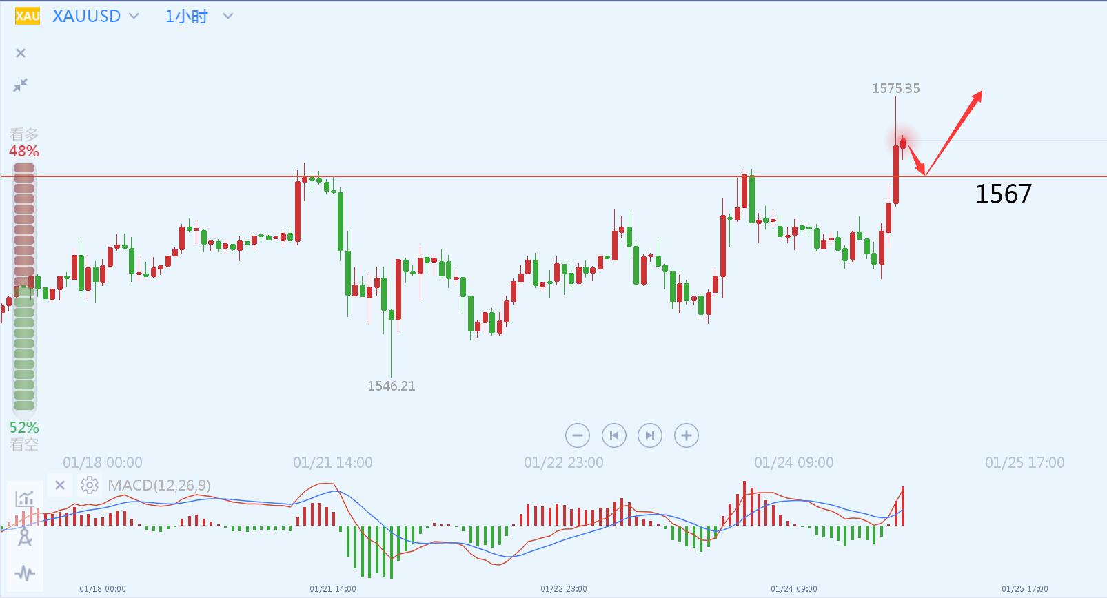 文/胡永润 一天,一年,一生,生命的岁月,岁月的光阴,云水相渡,风雨相伴。逝去的,教会了我们如何珍重和道别;正在经历的,教会着我们如何崇尚和相守;未来的,则无限的唤发着我们创造和认知世界的力量和意义。在新春到来之际,胡永润首先祝愿各位朋友在新的一年里,身体健健康康,生活平平安安,交易顺顺利利,日子红红火火。 黄金可能是受避险情绪影响,短线拉升近20美金至1575美元/盎司上方,为1月8日以来首次。昨日亚欧盘时段,黄金一直延续回落走势,美盘开盘后,行情反转,强势上行,不仅回撤了日内所有跌幅,而且突破前期的关键压力。 这段行情走的让人喜忧参半,喜是因为行情终于加速了,迎来了关键突破,结束了近两周