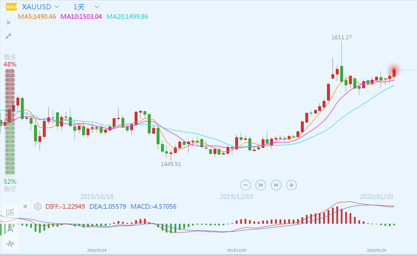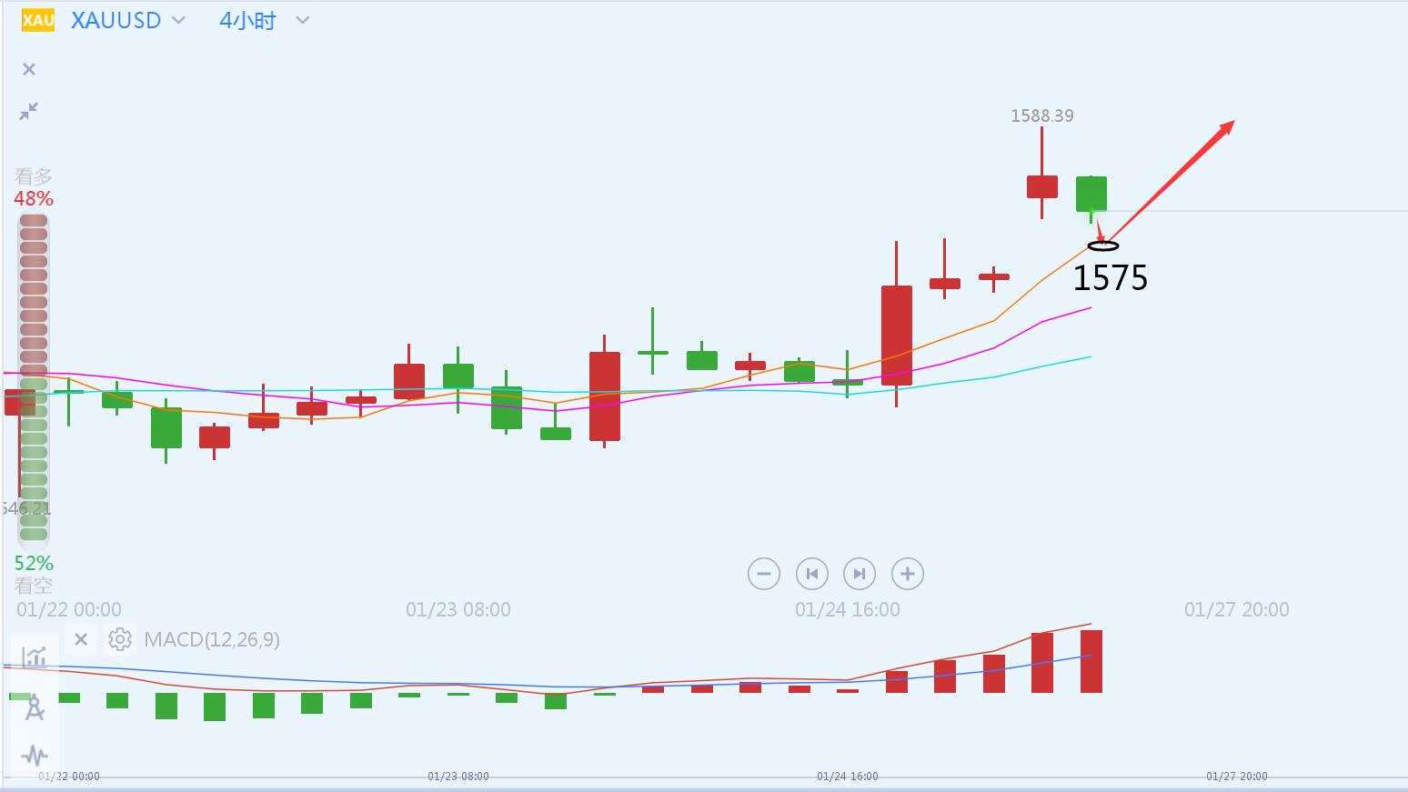 文/胡永润 这个春节为自己和他人的健康安全着想,几乎不出门。一首音乐,一杯清茶,一本好书,它们恰似一个灵魂的知己,在你孤独的时候,默默的陪你,在你心烦的时候,能为你解忧,在你迷茫的时候,能带你走出低谷,让心情豁然开朗,让灵魂在安宁,祥和,美好中静静感悟。 因市场下调全球经济增速预期,市场避险情绪升温,给黄金提供了上涨动能,周一开盘向上跳空9美金,盘中金价一度到达1588美元/盎司,随即出现回落。 4小时线级别,MACD指标红柱放大,5/10/20日均线交金叉,价格位于5/10/20日均线上方。小时线级别情况同上。15分钟线价格在达到高点后逐步回落,目前位于20日均线上方,5日均线拐头向下,M