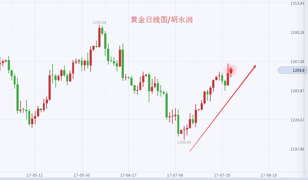 文/胡永润 国际现货黄金周四(7月27日)企稳微跌,美市盘中最低下探至1254,短线惊现跳水,金价再度退守1260一线之下,周三美联储FOMC发布决定维持利率不变,金价一度飙升至六周高位。周四美元止跌反弹,有探底回升的态势。日内公布的多项重磅数据对黄金有利有弊,美国至7月22日当周初请失业金人数为24.4万人,比前值略高;