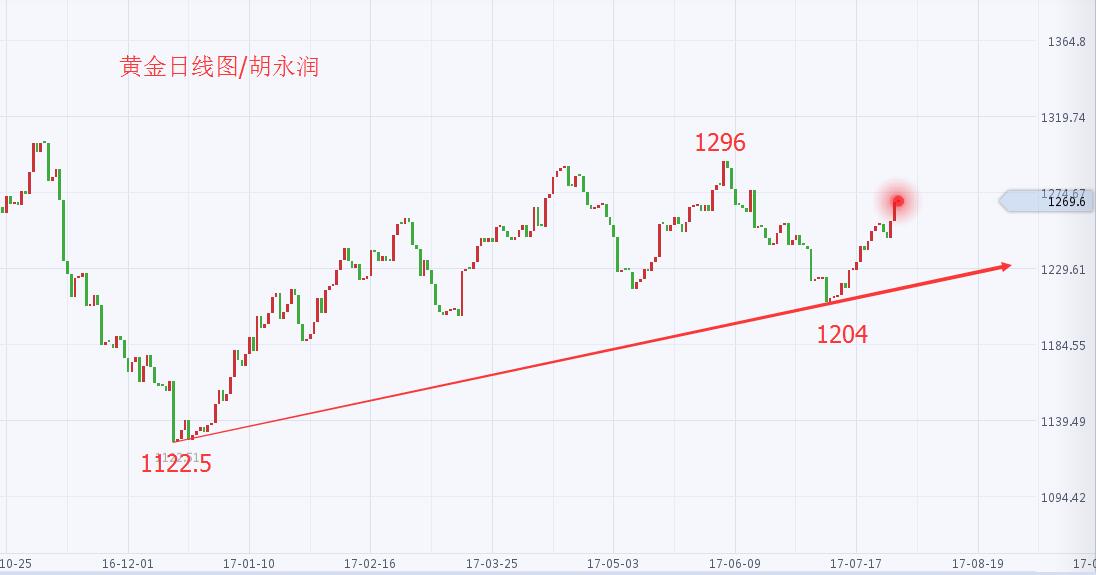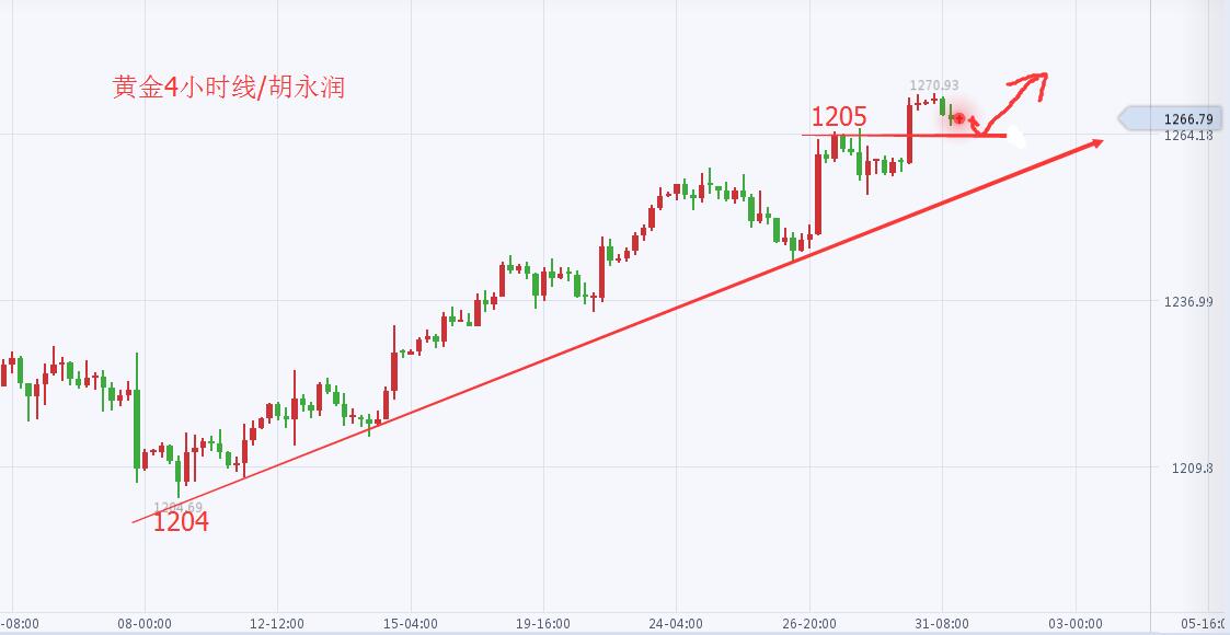 文/胡永润 黄金年内第四次回撤再度企稳V型反转,尽管下破了前面1180-1195-1214形成的回撤趋势线,但是1205还是企稳反转。也就是3月份以后整个黄金行情走的都是大宽幅洗盘整理,而且偏多。1205底部整理一周向上突破结束了1296顶部的五周极弱空头走势。第二周强势延续,确立多单反转,而上周开始陷入多头停顿修复洗盘整理。 周