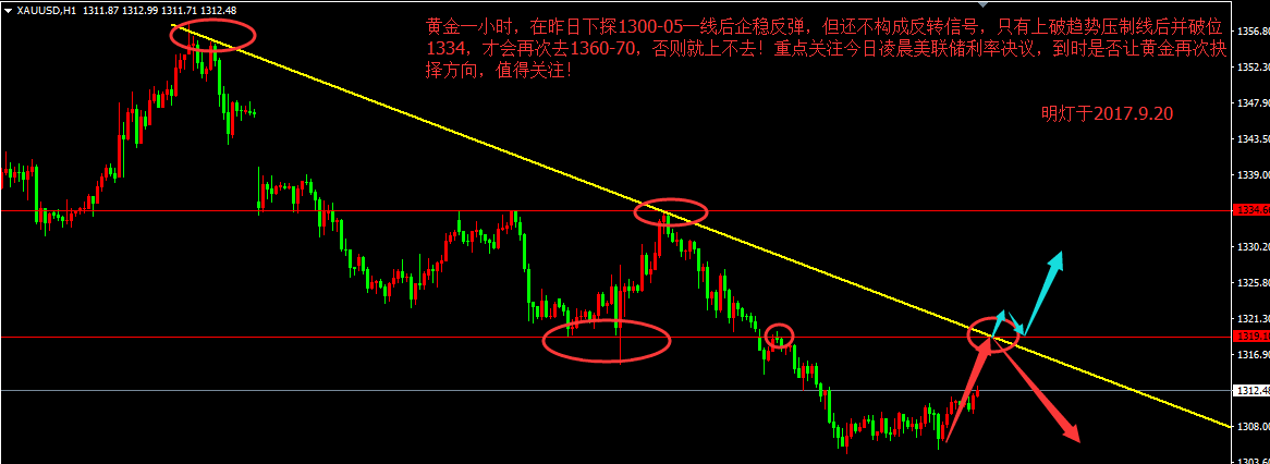 周一,黄金避险情绪降温,小幅跳空低开后,并没有太多的回补。最多不过反弹到1319.5附近压力,而1320正是压力所在位置,压制确认后介入空单是个不错的选择!当时盘中安排1317/18空单依然很完美,最后在1306附近直接获利了结,对于日内单子来说,10美金左右的利润很是不错了,毕竟近来黄金波动小了不少! 昨日,黄金让多空都
