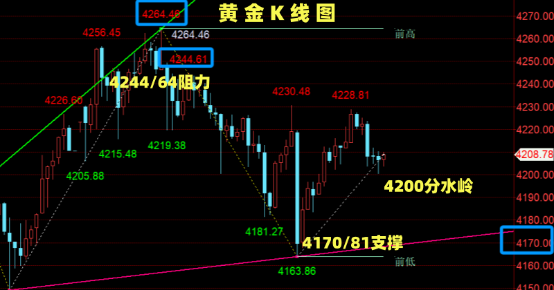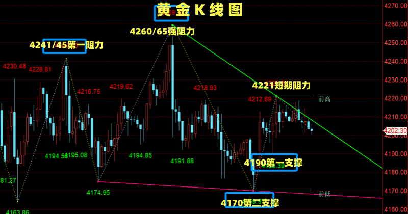 现货黄金: 消息面:今日周三(12月3日)亚盘时段,金价回落至4210美元附近,交易员在数据公布前获利了结令涨势暂歇。市场紧盯周三ADP就业与ISM服务业PMI,以判美联储动向。尽管短期内因获利回吐而出现小幅回调,但多重利好因素正悄然积聚,投资者们的目光牢牢锁定在美联储即将到来的政策会议上。当前,现货黄金价格围绕4200美元/盎司震荡,市场情绪在降息预期与经济数据之间摇摆不定。全球央行购金热情高涨,美债收益率回落,以及地缘政治紧张局势的升级,都为黄金提供了坚实的支撑基础。 技术面:昨日“深V”反转,今日黄金大概率进入区间震荡格局。上一交易日金价连续下行,不断刷新低点,无论从持续时间还是回落力
