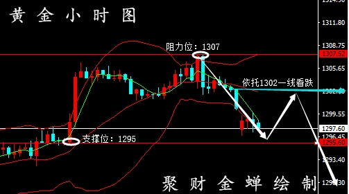 ——黄金行情分析—— 目前黄金黄金日线受到5日线的压制偏空一些,只是美元短线多空不定,周线上影线受阻。使得黄金短线迂回,即使看上去很弱。但是美指稍微下跌一点,黄金就伴随反弹,上方5日均线和10日均线死叉向下运行,所以今天依旧聚财认为是震荡偏空的思路,不过日线布林带向下收口运行,所以下方的空间也有限,4小时围绕1307下方看空思路不变,目前的台阶下跌通道未改变,上周多次冲击1307突破未果,本周前一次高点就是空头临界点,那么短线阻力,聚财提示继续关注1298/99一线,其次短线阻力聚财提示关注1295/96,日内操作上不破此位置可空一次 下方需要关注的是1297/89一线支撑,黄金早盘回撤到了