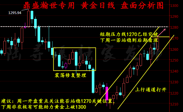 陆寻溪:黄金下周行情走势分析,非农能否助力黄金上破千三?空单被套怎么解? 文/陆寻溪/QQ:2583963224 本周的行情结束了,不论结果是盈利还是亏损,给自己放个假,不要忘记除了投资你还有家人要陪,还有生活要过,投资不是你生活的全部,无论你怎样纠结,周一开盘行情是涨是跌都不是我们可以左右的,套单的朋友不要着急,