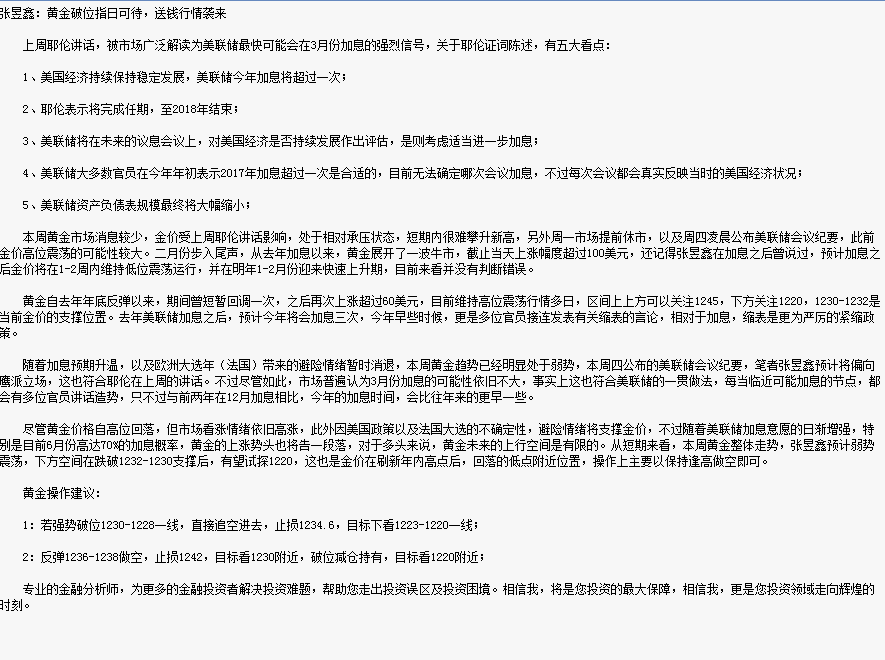 张昱鑫:黄金破位指日可待,送钱行情袭来 上周耶伦讲话,被市场广泛解读为美联储最快可能会在3月份加息的强烈信号,关于耶伦证词陈述,有五大看点: 1、美国经济持续保持稳定发展,美联储今年加息将超过一次; 2、耶伦表示将完成任期,至2018年结束; 3、美联储将在未来的议息会议上,对美国经济是否持续发展作出评估,是则