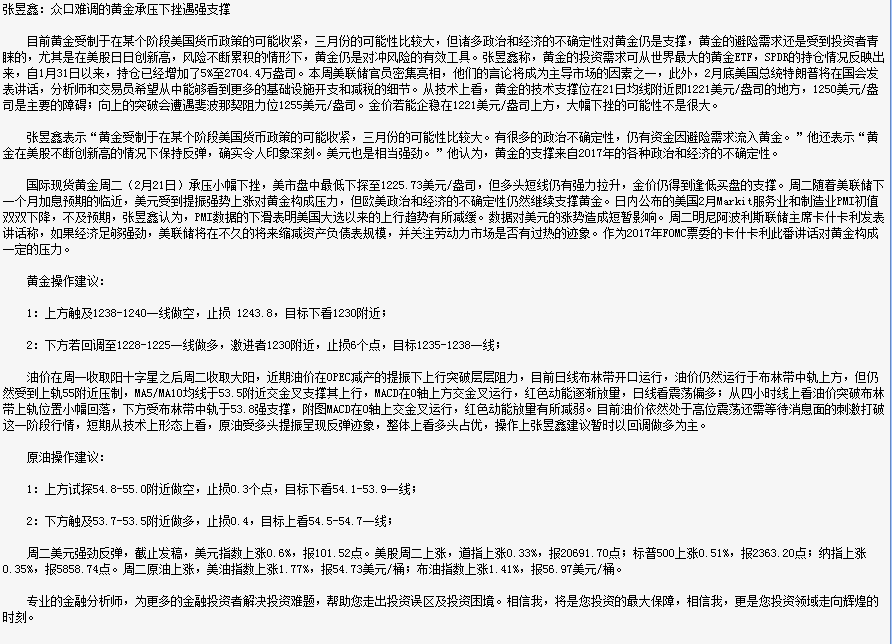 张昱鑫:众口难调的黄金承压下挫遇强支撑 目前黄金受制于在某个阶段美国货币政策的可能收紧,三月份的可能性比较大,但诸多政治和经济的不确定性对黄金仍是支撑,黄金的避险需求还是受到投资者青睐的,尤其是在美股日日创新高,风险不断累积的情形下,黄金仍是对冲风险的有效工具。张昱鑫称,黄金的投资需求可从世界最大的黄
