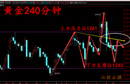 投资市场我们不仅要有实力,更需要有控制力。投资没有如果,把握住就是利润。钦云有一句想说,投资是为了徐循渐进的盈利,很难一夜暴富。温水能煮青蛙,稳健才能长远盈利。 黄金方面 黄金昨日美盘至此整体波动不大,基本围绕在1254关口窄幅震荡。从四小时图来看,M10拐头下行,价格运行于M5附近,布林通道张口向下扩散,价