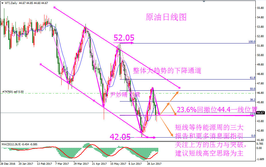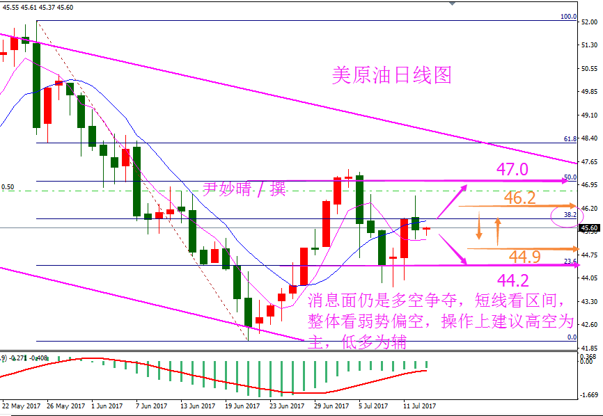 原油分析 原油方面 7月12日周三美国WTI 8月原油期货电子盘价格收盘下跌0.31美元,跌幅0.68%报45.61美元,稍早的API数据公布后,市场已经反映了这一利好,油价在周三冲高跳水转涨为跌,一方面因EIA报告数据显示,美国原油库存骤降抵消了汽油需求疲弱数据带来的影响,不过美国原油产量增加仍然施压着油价转跌,其次在OPEC公布