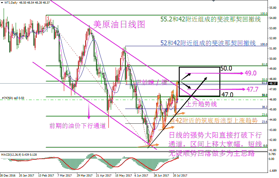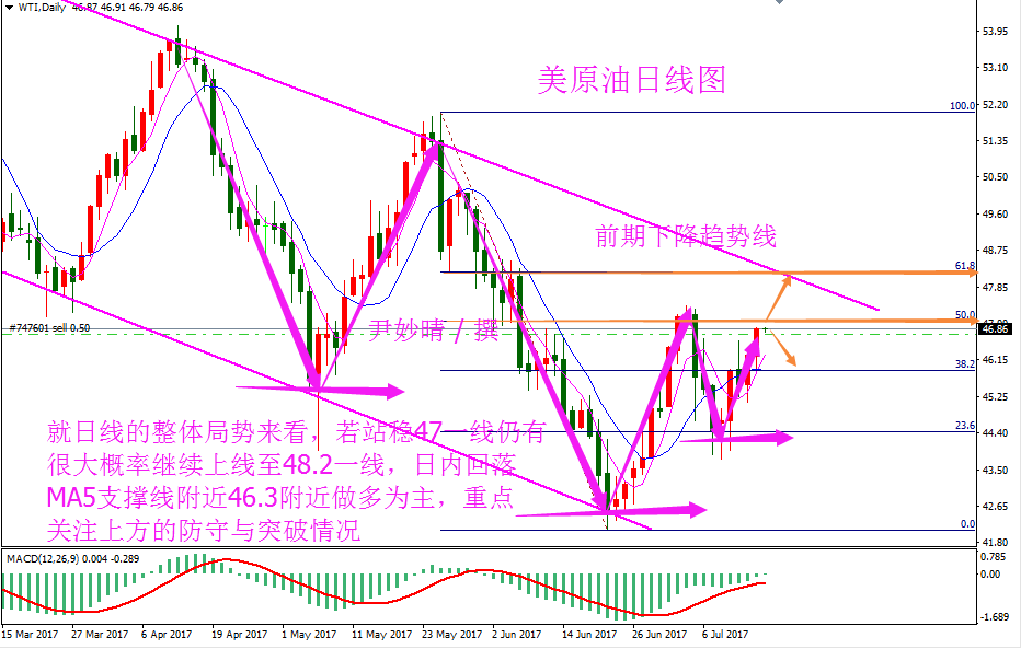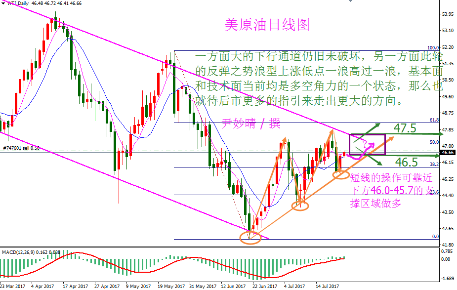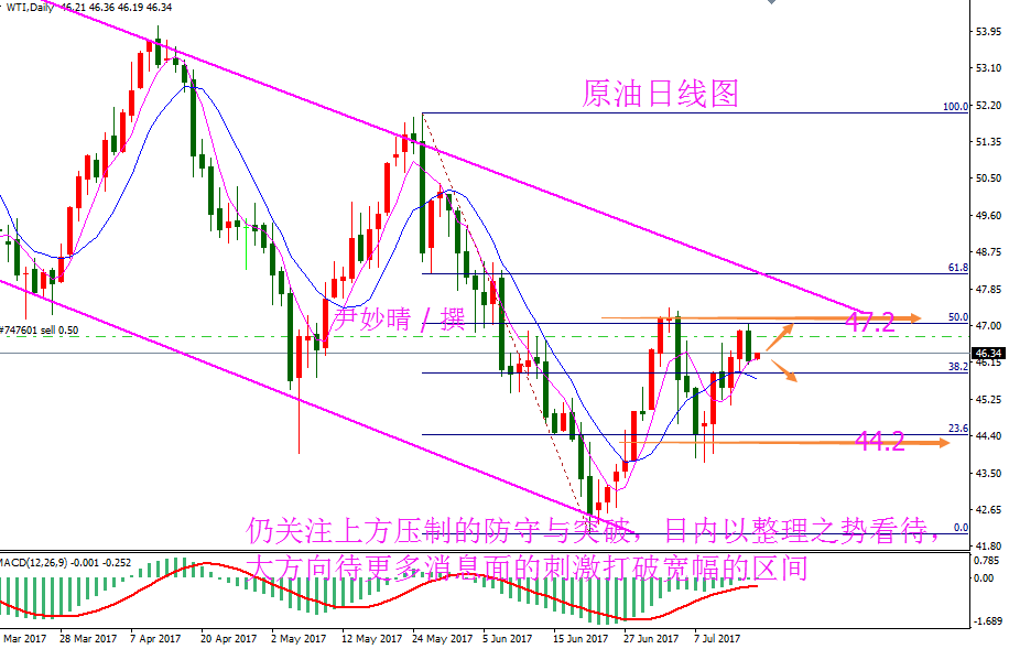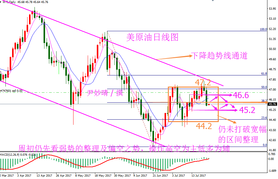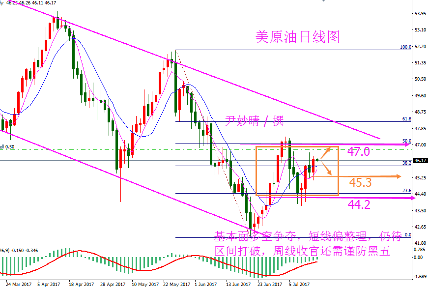 原油分析 原油方面 7月17日周一美国WTI 8月原油期货电子盘价格收盘下跌0.68美元,报46.0美元。周一亚盘时段油价基本持稳在两周高位附近,因受助于美国原油库存下降,原油生产略有放缓以及中国需求有增加的迹象。但在欧美盘时段由于关键产油国产量持续上升加重了市场对供应过剩问题的担忧,油价下挫。周一油价下跌逾1%,投资