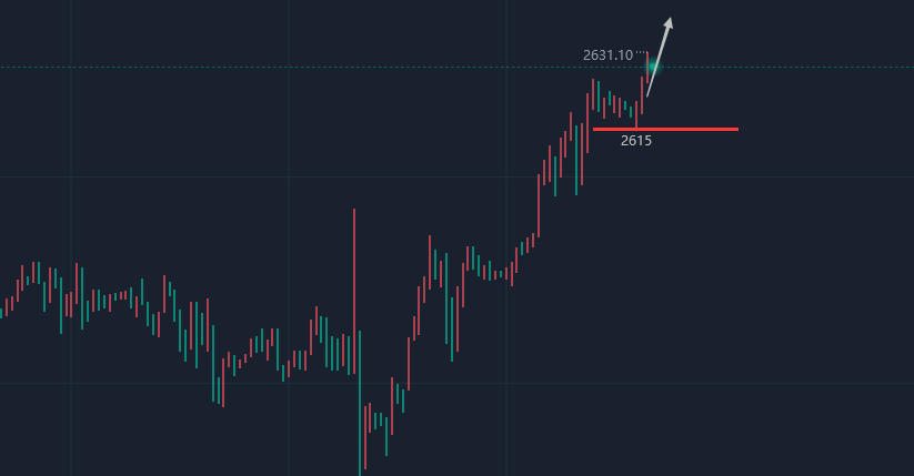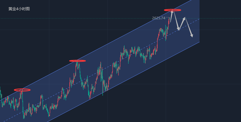 每一次的相遇,结识到相知都不容易,茫茫金市中,能够遇到就是缘分,无论是哪位朋友,江沐洋在这里承诺,有问必答,有求必应,江沐洋有可能做不到百分百正确,但是我知道这个市场就是在做大概率事件,只要我们能够稳定盈利,那么结果至少还是很好的,也感谢大家的信任,近期继续布局波段,一定严格按照策略,经得起诱惑,守得住繁华,把利润无限放大,下一波,江沐洋与你同行! 消息面: 周二亚市尾盘,现货黄金短线突然急跌,金价自稍早触及的历史高位2639.96美元/盎司大跌,目前跌至2625美元/盎司附近,日内转为下跌。当前黄金前景偏向上行,不过反弹似乎已经过度。RSI已转为超买,暗示买家仍在掌控市场,但可能出现回调。