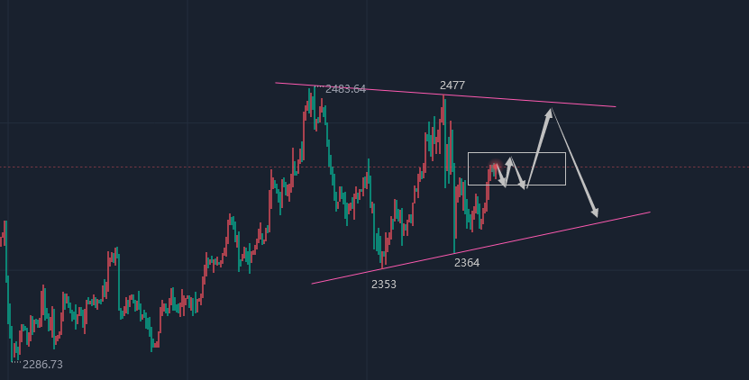 江沐洋专注分析期货黄金、白银、纸黄金、纸白银、现货黄金、美原油、伦敦金、外汇黄金原油等金融理财投资产品。江沐洋本着负责,专注,诚恳的态度用心写每一篇分析文章,大道至简。12年黄金操盘经验,力求准确可靠分析每天行情,帮你少走弯路,直通财富自由之路! 黄金走势分析: 从技术面来看,日线连续五日收阴,昨日黄金冲高回落维持震荡走势,虽然没有破低2364,但整体日线结构上还是弱势,不过日线布林带目前处于收口状态,近期不看好能跌破日线下轨支撑2360,所以,近期黄金只要保持在2360之上,就以底部震荡整理看待。由于趋势没有改变,整理后依然是选择高空交易, 4小时布林带持续收口中,20均线仍然保持着趋势下