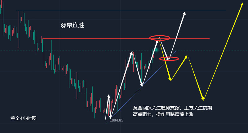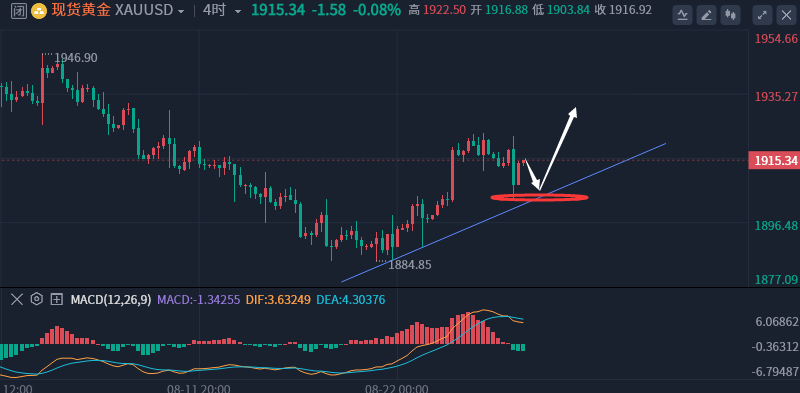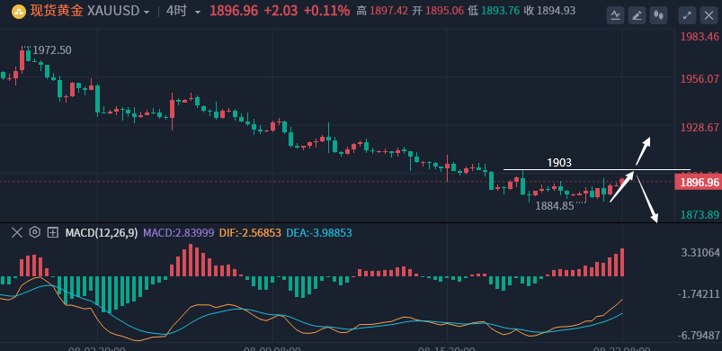 势不变则守,势变则随,顺应市场的节奏去进行,而不是与趋势背道而驰,行情绝对不是靠臆想,而是靠不断的分析和推断,找出将会进行的大概率事件,对于短线交易而言,多和空交替进行很常见,而一旦行情选择方向走极端,那么必然会势如破竹般的进行,所以思路清晰,加上遵守原则,方能够保持稳健盈利! 黄金走势分析: 周三(8月23日)亚洲时段,现货黄金小幅上涨,目前交投于1902.74美元/盎司附近,临近杰克逊霍尔年会,市场观望情绪渐浓,美元指数和美债收益率回落,美元指数远离近两个半月高点,10年期美债收益率远离周二创下的近16年高点,给金价提供支撑,另外,金价在1890下方企稳后,部分逢低买盘进场,也给金价提供