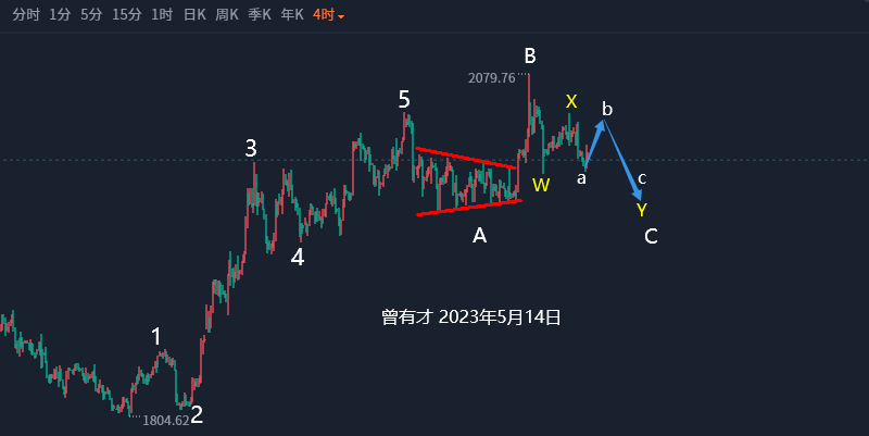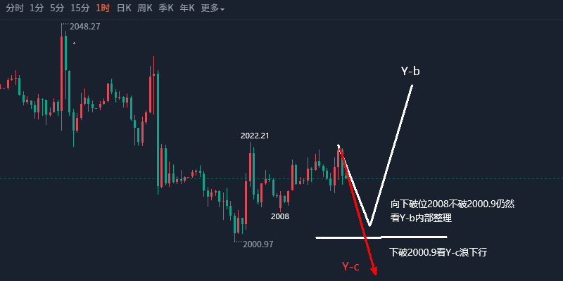 高手临盘,观其形、辩其意、审其时、度其势、动于阴末、止于阳极,其心如山之不动,其性如水之无常,深得阴阳互化之奥妙,涨跌之平常,无喜无悲、无物无我、以无法为法、法法相依是为高手! 黄金日线级别1804-2048运行五波驱动模式,2048为起点运行ABC整理结构,C段进入下跌中后期,2079向下会跌到哪里,后市行情怎么走? 结构:黄金昨日向下破位2000关口走了一波加速,最低跌至1985一线,如上图2079向下C段进入后期,目前A、C段对比,A段2048-1969运行80美元,C段2079向下到目前为止94美元,C大于A,目前C背驰于A,如果ABC运行顺势形结构,那么C段下跌不会突破1969即可