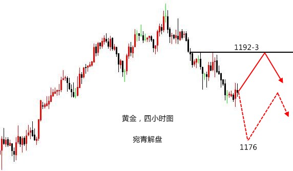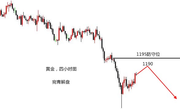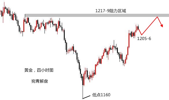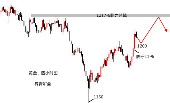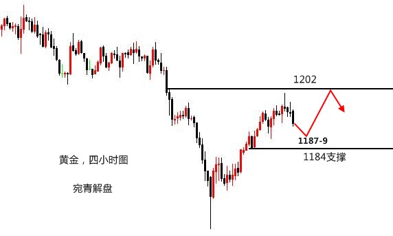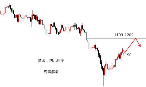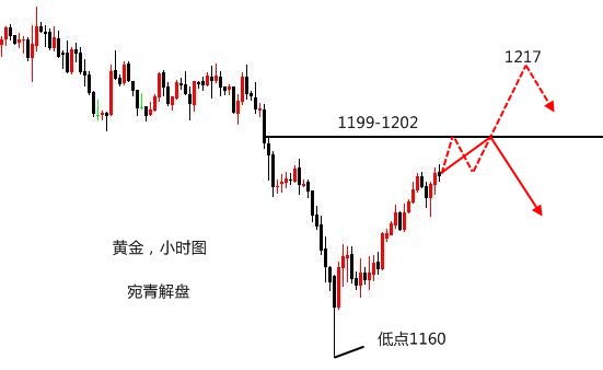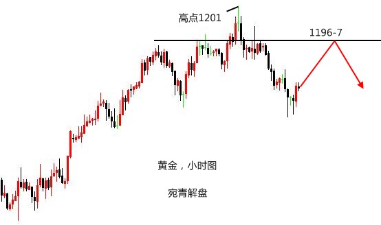 莫被一时之得失冲昏头脑,一味陶醉于暂时的胜利。自己一定要居安思危,切莫居功自傲,洋洋得意。陶醉胜利,意味着驻足停顿,陶醉胜利,意味着失去警惕。人生路上要永不松懈,胜利仅仅是一个小小的路标。要想取得最后的胜利,只要努力,努力,再努力。 黄金,在昨日的操作中,看好的是双顶回落。首先观察这一路的反弹力度,并不算强劲,所以上升的幅度是有限的,之前在1197附近受阻回落,但站稳高位,说明还有一定上冲力度,所以做空的点位上移至1199-1202区域,晚间因为担心上升加速,故将做空点位重新判定为1202-4,实际最高位在1201附近,基本符合预期。 当然,进场的点位不见得就有原本计划的那么好,比如本人的单
