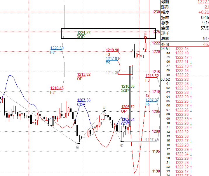 黄金昨日在我们提到的支撑位置1198再次拉升 直接到了目标位置xop=1224,预计这里有个回调,黄金现价1222直接做空 破1225止损 目标1218 1215附近。稳健的 我们继续等下方趋势做多 下方支撑f3=1213附近 操作上黄金下方1214做多 破1210止损,目标继续上看1220 1222附近 个人观点 仅供参考