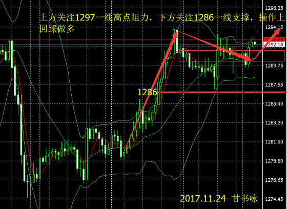 甘书咏:11.17金价区间收缩将迎爆发行情 日内黄金原油操作解析 隔日(11月16日)金价小幅下跌,维持区间波动,因美国众议院通过了其税改立法议案,美国财政政策走向可能使此前预期中的加息对市场的影响发生变化,现货黄金小涨0.05%,报1278.75,盘中金价一度触及三周半高位1289.09美元。原油隔日油价再次下跌,因对美国产量和