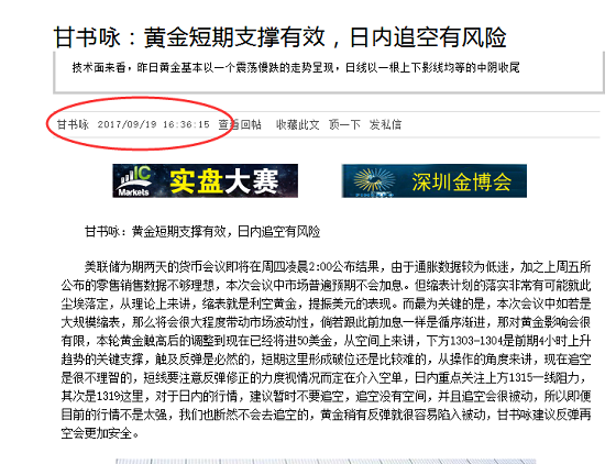 甘书咏:美联储会议前黄金承压,日内金价先涨后跌 昨日的走势符合甘书咏预期,而昨天金价在临近千三跌不动情有可原,1303是4小时线的起涨点想要一次性下破还是有一定的难度的,,而笔者在昨日的文章从下方有限的空间以及操作做单的角度来分析,1306低多看反弹的思路是完全正确的但也仅仅是短线而已,虽然行情节奏换面但是无