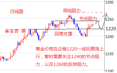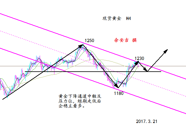 余安吉:3月20日MT4外汇黄金走势分析与操作建议 周一(3月20日)市场消息面比较清淡,日内主要是看一个技术面的指引。 上周五收盘,黄金表现平淡,多头并没能借着美元走低的东风走出向上的突破,打压了一部分看多投资者的积极性。当前来看,黄金是一个围绕周线布林中轨以及均线密集区域1230一线进行整理的趋势,无论是多是空量