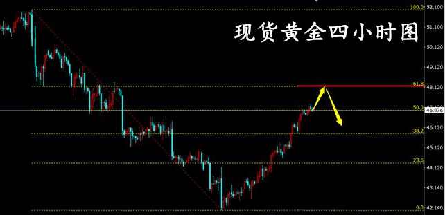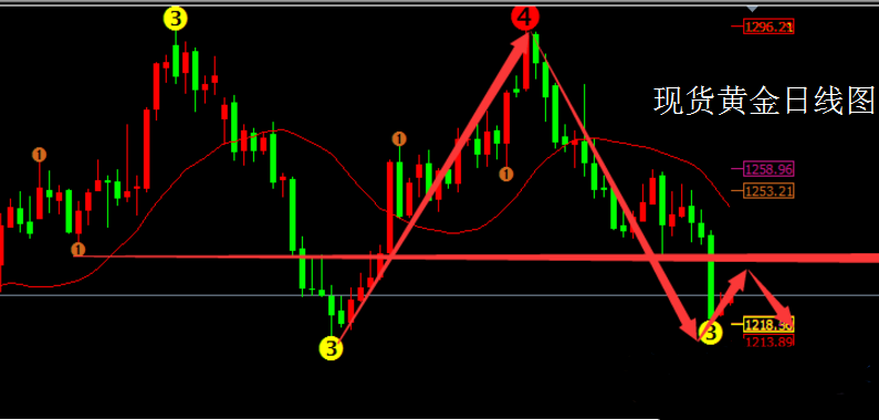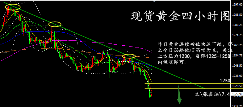 行情分析 黄金周一强势破位1240后金价遭遇滑铁卢,价格相继跌破1230-1220关口,日线大级别周期上黄金1230是上升趋势线的底部位置,但是价格能够有效跌破此位置并且没有任何的反弹出现,那么近期金价继续走低的可能性极大,隔日金价未能续跌小幅反弹调整,但也刷出了新低,通常情况下这种破位后的调整是对破位后势能的一种蓄