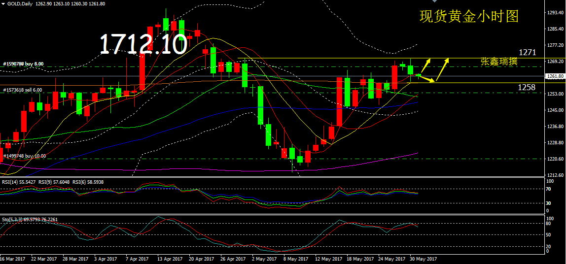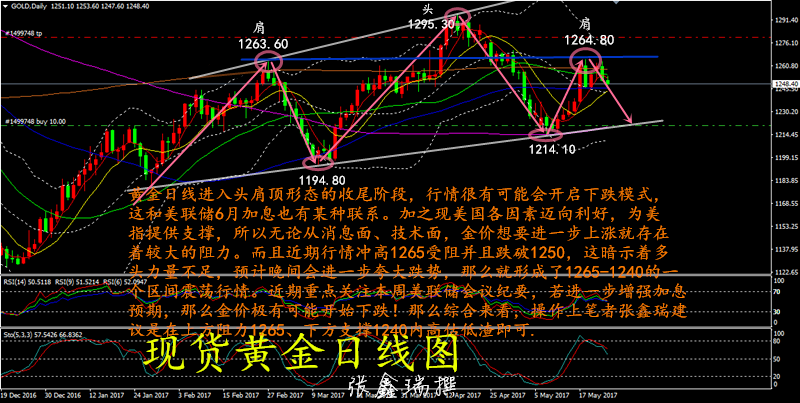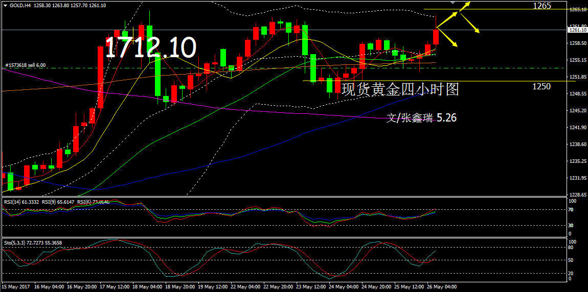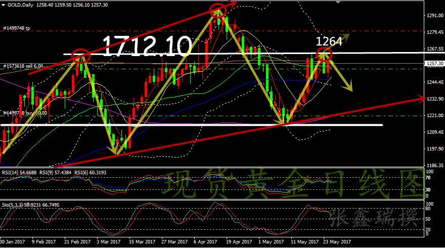 技术分析 今日亚盘金价走势还是延续弱势区间,直到下午的一波冲高回落,才破今日高点,目前金价暂时在1264附近震荡。从日线图来看,布林带张口向外,MACD金叉开口收敛,红柱动能有所缩量,KDJ及RSI指标交叉向下发散,整体日图指标偏弱;K线运行于中轨上方,并跌破5日均线支撑,5日、10日均线形成金叉开始走平,这说明黄金短