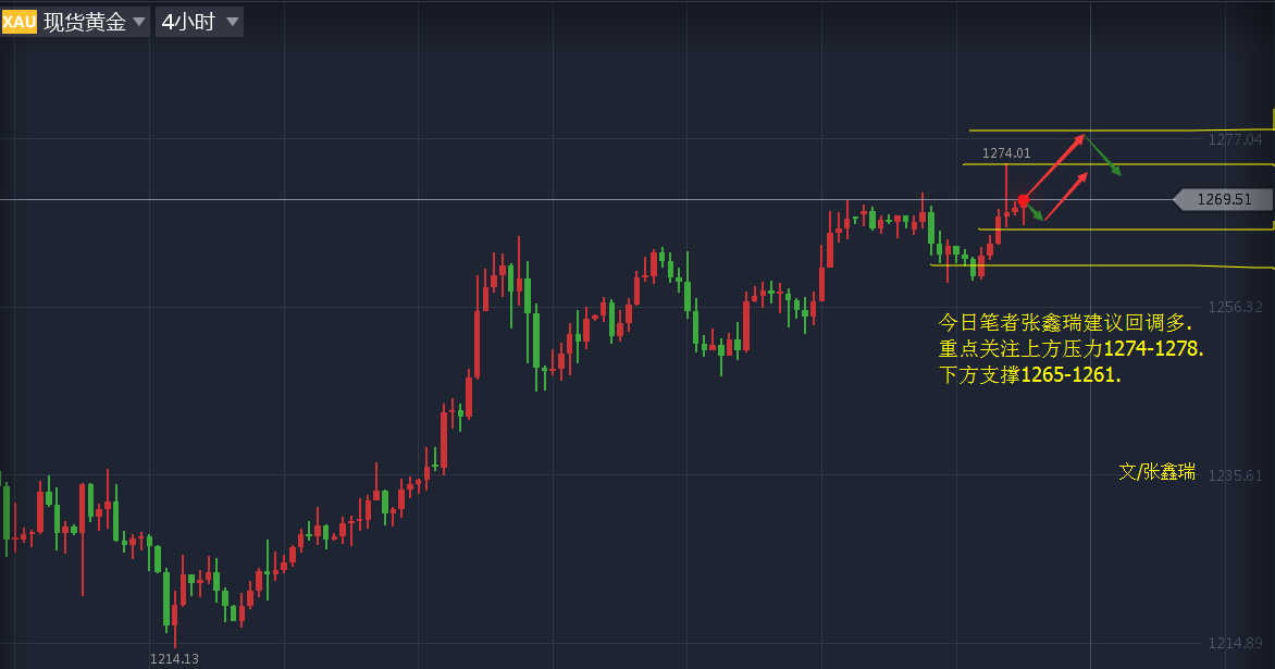 >>技术面<< 从日线图来看,在上周四回调收阴导致日线图中断连阳,不过整体趋势依然是多头无疑。价格直逼高点1265一线,这一点也是近期笔者一直坚持的思路;今日亚盘整体波动比较小,最高达到1263.60,最低1259.60,整个亚盘都在这区间震荡,现在我们要做的是等待区间破位,从而抓住最佳进场机会,笔者是比较看好上方高