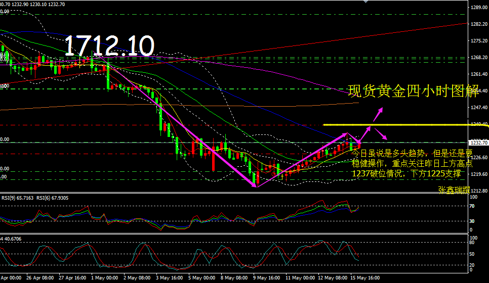昨日行情回顾 昨日整体行情还是比较强势的多头趋势,价格一直徘徊在四小时5均线上方运行,亚盘从低点1226开始走反弹,欧盘初次回落试探下方1228后再次高走,美盘由于日内公布的纽约联储5月制造业指数意外跌至负值,导致美元跌势加剧。助推黄金刷新1237美元|盎司高位。整体空间还是保持在10美元左右的波幅。目前上方压力就是