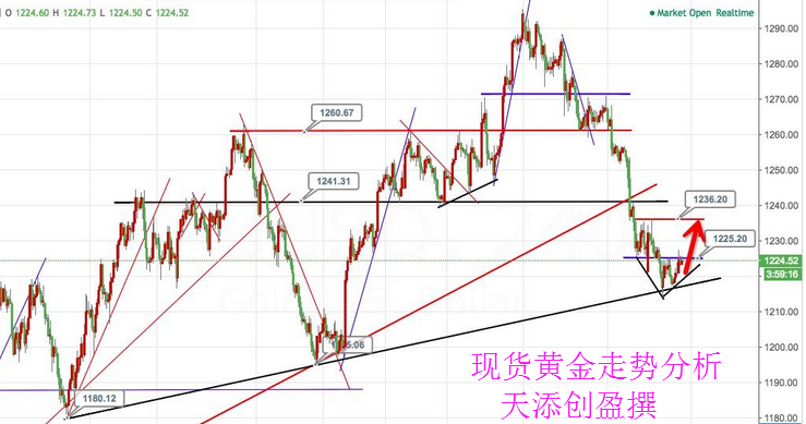 天添创盈:经济数据疲软拉低美元,5.16 现货黄金 操作建议 昨日现货 黄金 继续反弹出现三连阳,在晚间美盘时段,美国经济数据表现不佳的提振之下, 金价 曾一度逼近1240美元一线,但随后出现冲高回落,最终收盘于1230美元附近。因朝鲜地缘局势,暂无恶化消息,市场避险意愿有限。且欧洲方面,法国新总理任命符合市场预期以