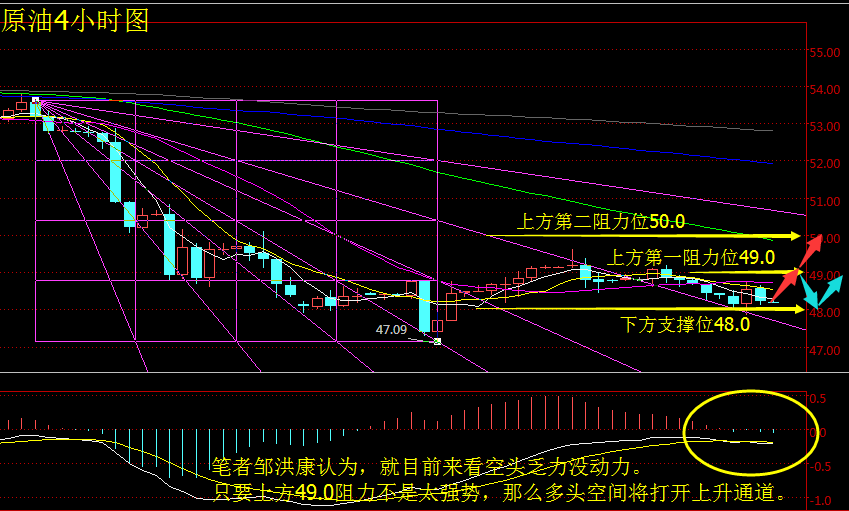 原油走势分析: 原油昨日深V走势清晰可见,午盘反弹至48.8美元在现在看来只为了更好的下跌,果不其然欧盘尾油价遭opec月报利空打压逐级下探,最低下探至47.09美元,几乎触碰到47美元的地板。也是点到即止,且沙特解释称产量提高是因为国内库存增加,油价才有所回升,短线底部进一步明确。并且早间由于API意外利多,配合着