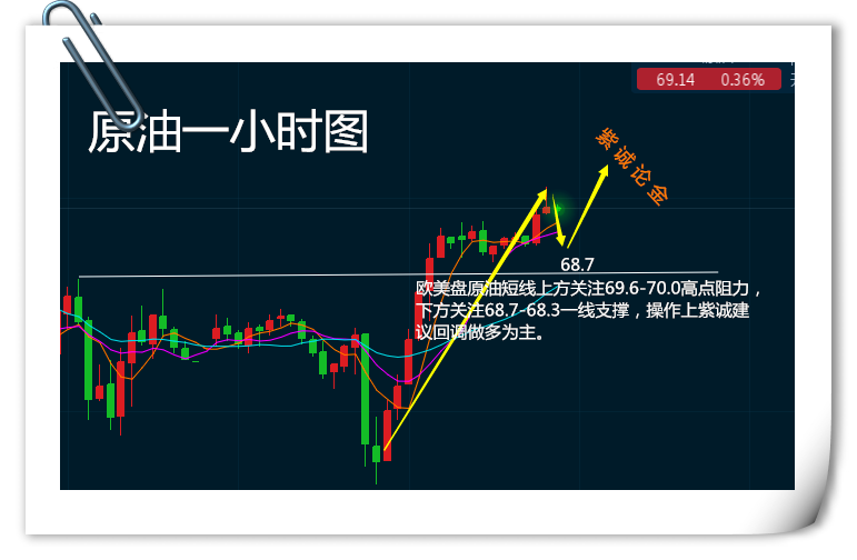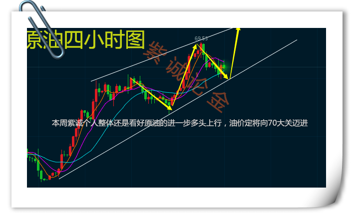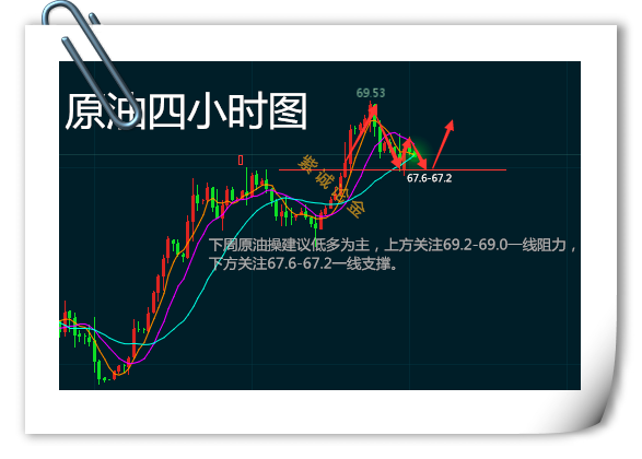 各位投资者大家早上好!油价上周上探69.55高位后出现了震荡回调的走势,短线回踩67.6一线附近,其支撑力度非同一般,从下方多头排列的长期均线系统来看,后市回调幅度预计较小,附图指标KDJ更是在超卖区域形成了向上拐头的雏形,后期止跌企稳再次上攻的概率在不断加强。 油市解析: 虽然美国总统特朗.普指责石油输出国组织(