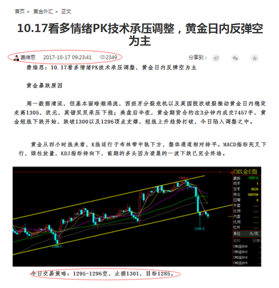 费维思:10.17看多情绪PK技术承压调整,黄金日内反弹空为主黄金暴跌原因 周一数据清淡,但基本面暗潮涌流,西班牙分裂危机以及英国脱欧破裂推动黄金日内稳定走高1305,欧元,英镑双双承压下挫;美盘后半夜,黄金期货合约在3分钟内成交7457手,黄金短线下跌开始,跌破1300以及1296顶点支撑,短线上升趋势打破,今日陷入调整