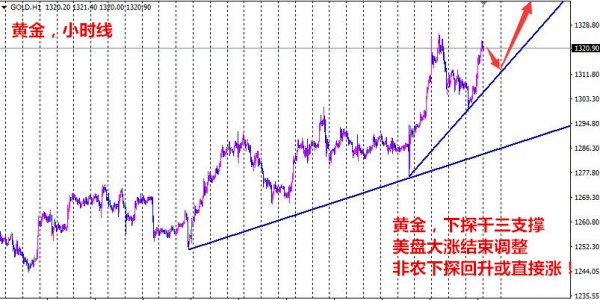昨日行情回顾: 近期黄金随着避险的不断升温多头动能变得惊人,昨日黄金日间走出回调之势回补周一缺口后继续的拉升上行,昨日的文章分析已经明确分析了黄金的大趋势多头之势,而周一的跳高开缺口是昨日日间看空的唯一原因,也指出了高位追多的不合适性,等待回调看1327-1328的区间支撑在继续看多。昨日的黄金走势完美验证了