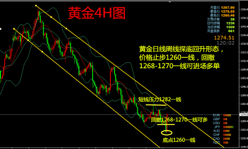 -------黄金行情分析------ 黄金从大结构的1204-1357的波段反弹后大幅度下跌,回撤0.618分割线支撑位置1260后强势反弹。再次触及1306开始回落,结构上已经出现偏差。周线界别收线大阴,之前的强势上涨一去不复返。从目前的整体盘面行情走势来看,黄金已经明显的偏弱势。尤其是周二周二走的下探反弹,并没有突破企稳阻力区间