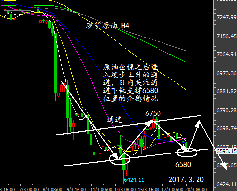 分析: 原油价格在今天日内延续了多头节奏,不过整体的多头力度并不是很强,当前行情主要的支撑位置依旧位于早间开盘后直接走高的支撑6580附近,在晚间投资者需要继续关注该位置,在测试不能够破位的情况之下,仍然可以进行做多的操作 另外,当前上方的主要压力位置位于日线级别的均线价格,均线价格目前虽然弱势的格局已经