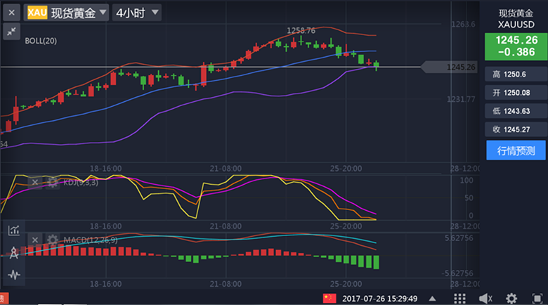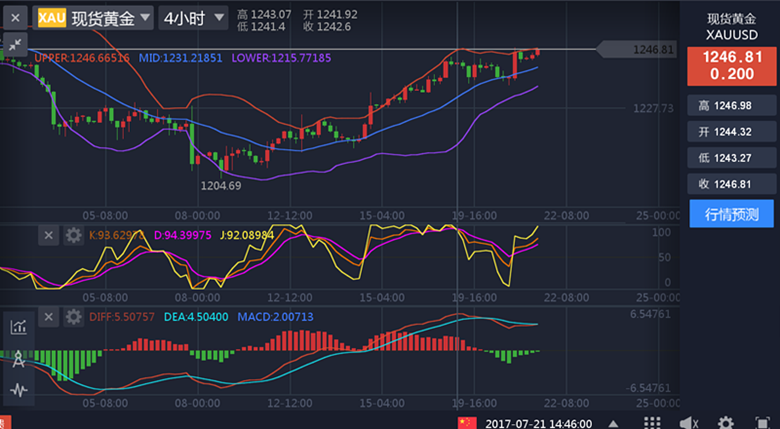 周二黄金白银继续上涨,黄金昨日开盘1234美元/盎司,美盘触及两周高点,最高上探至1244.46美元/盎司,创7月3日以来的最高水平;美元周二大幅下挫,下跌至10个月低点。随着黄金逐渐向上攀升,眼下金价已经突破1240美元,对于1250这一压力位只差临门一脚。不过宝成言金从早盘行情来看,金价在冲高接近1243之后似乎受到压力打压