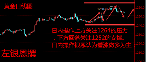 每逢大行情,总有人被套住,这里左银恩再一次提醒大家,做单一定要带好止损,不要为自己的一点点失误出现套单甚至爆仓。做投资侥幸要不得,一定要稳健操作。这里也提醒大家,做这种数据行情,不要提前布局,我们最好的就是等到数据出来顺势而为,稳健把握利润。 黄金方面: 日黄金在美盘时段刷新高位,最高触及1253附近,因