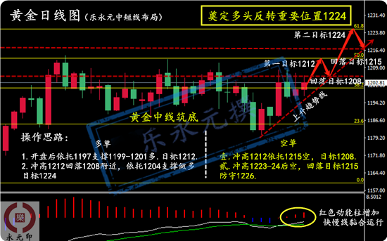 为何黄金多头情绪释放?股票市场还能做吗 多头的释放其实还是归功于股市的不景气,近年来也有不时有股票投资者找到永元(虽然我之前也做过几年股票),但是我明确说明了目前股票的市场并不好参与,毕竟有买卖的限制。周一大笔资金救市,虽然股票市场暂时回暖,但是也只是饮鸩止渴罢了。 中线多单果断布局·底气从何而来? 从上周周四的一波下跌1218开始,永元心目中就已经诞生了中线多单的布局计划!下方1208作为防守点位,1208作为上一个震荡区间的顶部,突破了就说明上方空间已经打开。1218布局多单;乐永元也多次提到了,近期未突破1230阻力,思路依然是短线的震荡,中线的多单。而今天,经过上周五、本周一、周二的