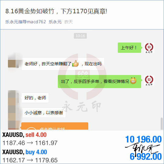 千万别放弃!有了第一次放弃,你的人生就会习惯于知难而退,可是如果你克服过去,你的人生则会习惯于迎风破浪地前进,看着只是一个简单的选择,其实影响非常大,是截然不同的人生。 周三晚永元文章中已明确说明行情会继续下跌1170,果不其然收盘前跌至1274,周四早盘开盘后行情直线下跌1160,按照永元的思路是慢跌至1170反弹1178附近,但是这种急速下跌没有任何办法,但是思路依然是对的,先跌后反弹,所以我在1260针对实仓客户大胆喊多。乐永元微/信 macd762小赚170点利润,约rmb12w! 而后周五针对实盘喊单,临近1173附近继续进多,乐永元微/信 macd762目标1180,行情维持震荡