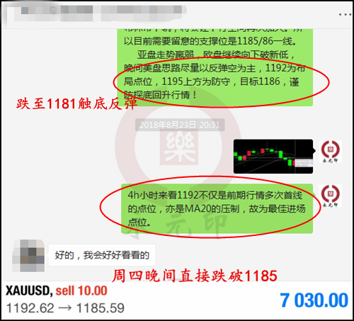 确定了短期上升趋势线,且趋势发生加速加强,我唯一能做的就是盯住趋势,顺势操作,在短期趋势没有改变之前,操作将一如既往的追随趋势,观察趋势发生的变化,将其变化记在脑中,什么都改变不了我对趋势的信心,我相信它给我的利润。在市场没有发出改变多头的信号,思维也不要变,乐永元微/信 macd762要记得市场没有永久的多头与空头。 上周末我文章就明确说明不要去做空,详情《8.18黄金你看到的只是利润,而我在意的是大趋势》周二晚间针对实盘喊单,维持低多思路不变,日常操作中,乐永元微/信 macd762做单必须要有自己的思路!这是做趋势,而不是去蒙点位! 现货黄金·行情分析 目前黄金超跌反弹探底,连续三天反