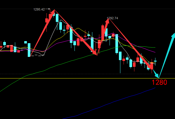 人生就像市场一样,也有一种向下的惯性。如果依然执迷不悟的放纵自己,结果只能是离理想越来越远。给人金钱是下策,给人能力是中策,给人观念是上策!如果你认可笔者的观点,那么笔者也很愿意与你一起交流探讨。 昨日行情回顾: 昨日持续横盘,一直在1279/1280一线徘徊。下午黄金走了一个反弹,刚好到预期的1282的位置,而