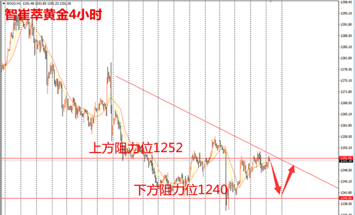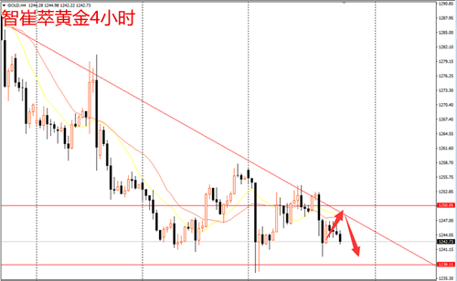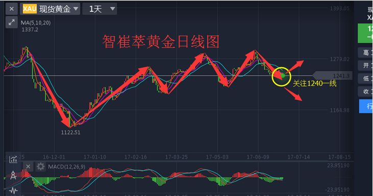 智崔萃消息面解析: 金价五月连涨趋势遭终结,6月以阴线结尾,月跌幅逾2.15[%],黄金价格交投于1241.09美元/盎司,后市走势趋于震荡。 多空大战一触即发: 利多因素:①美元指数下行通道并未关闭,后市有继续下行的风险,利好现货黄金价格; ②特朗普对朝态度强硬,朝鲜局势有进一步升温的风险,避险情绪为现货黄金多头提供