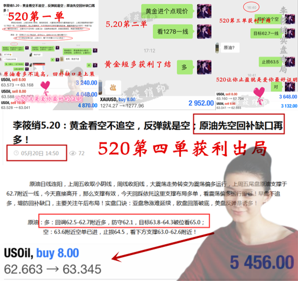 李筱绡5.21:黄金原油交易早餐,困境之中,饱含机遇! 读万卷书不如行万里路,行万里路不如阅人无数,阅人无数不如名家指路,名家指路不如筱绡带路,我依然是那个低调又有实力的李筱绡。 李筱绡一周操作回顾—----运筹帷幄之中,决胜千里之外--- 口说无凭,李筱绡只用事实说话,从上周末开始,李筱绡撰文给大家分析了本周行情趋势,一路劈荆斩棘,给了你无数的机会却跟不上我连续止盈的节奏。 5.20操盘交易回顾: 早盘筱绡在分析中说到,原油跳空高开不追多,谨防回补缺口,早盘在压力位63.8之下布局空单,顺利止盈6个点,黄金依托支撑1274多单在1278止盈4