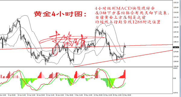 5.27李筱绡:黄金原油交易早餐;交易之道在于--志之所趋,无远勿届! 读万卷书不如行万里路,行万里路不如阅人无数,阅人无数不如名家指路,名家指路不如筱绡带路,我依然是那个低调又有实力的李筱绡。 5.27黄金原油日内操作计划: 黄金日线上K线站上布林带中轨上方,MA5均线向上勾头,MACD快慢线形成金叉,整体技术指标由空头转向多头,MA5均线支撑1279是本周重点关注点;4小时上目前处于双金叉向上的形态,不过上涨力度稍稍有些不够,MA5和MA10均线粘合,MACD能量柱也有所削弱,上方阻力点是布林带上轨1288,有回调迹象;小时线上,目前一众均线和K线都纠缠在布林带中上轨