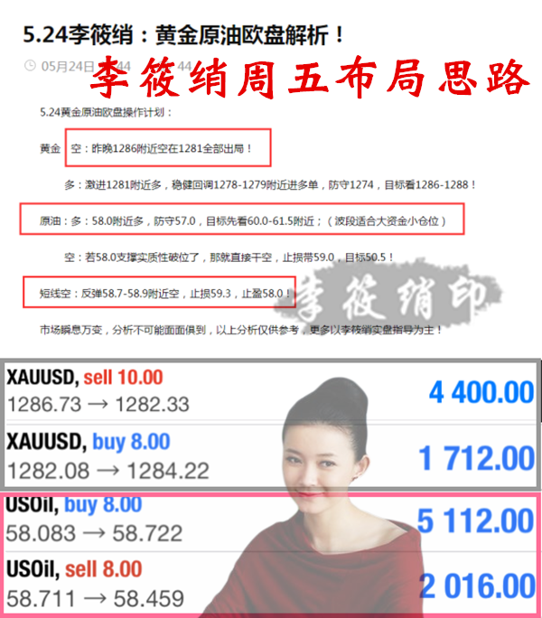 5.24李筱绡:黄金原油晚盘交易分析,周五收官注意风控! 读万卷书不如行万里路,行万里路不如阅人无数,阅人无数不如名家指路,名家指路不如筱绡带路,我依然是那个低调又有实力的李筱绡。 5.24黄金原油晚盘操作计划: 黄金:空:昨晚1286附近空减仓持有,若日内反弹1288不破继续空,防守1292,目标看1279-78; 多:回调1278-1279附近进多单,防守1274,目标看1286-1288! 原油:多:58.0附近多,防守57.0,目标先看60.0-61.5附近;(波段适合大资金小仓位) 空:若58.0支撑实质性破位了,那就直接干多,止损带59.0,目标50.5! 短线空:反弹59.1附