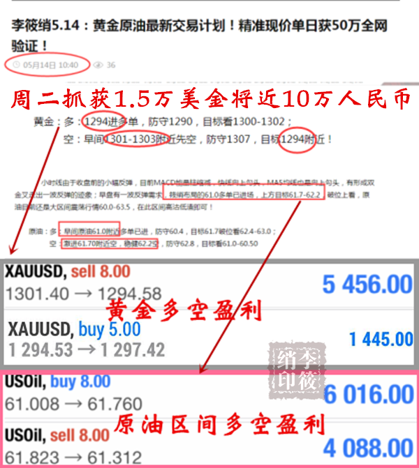 李筱绡5.14:黄金原油欧盘最新交易计划!精准现价单又获利有理有据! 读万卷书不如行万里路,行万里路不如阅人无数,阅人无数不如名家指路,名家指 路不如筱绡带路,我依然是那个低调又有实力的李筱绡。 ----运筹帷幄之中,决胜千里之外--- 交易回顾截止目前本周我们一共交投23单,无一损单,盈利23单,总盈利点数158,净盈利点数135,100%的胜率。本周和上周的交投我们可以看出,本周我们又增加了几个波段油的单子,所以利润空间比较大。 日月如梭,在过去的一周时间里筱绡在这个市场上所向披靡,豪取160点利润有余,可以说是完美至极,可是有些人却不同,在这一周的时间里过的浑浑噩噩,不知道