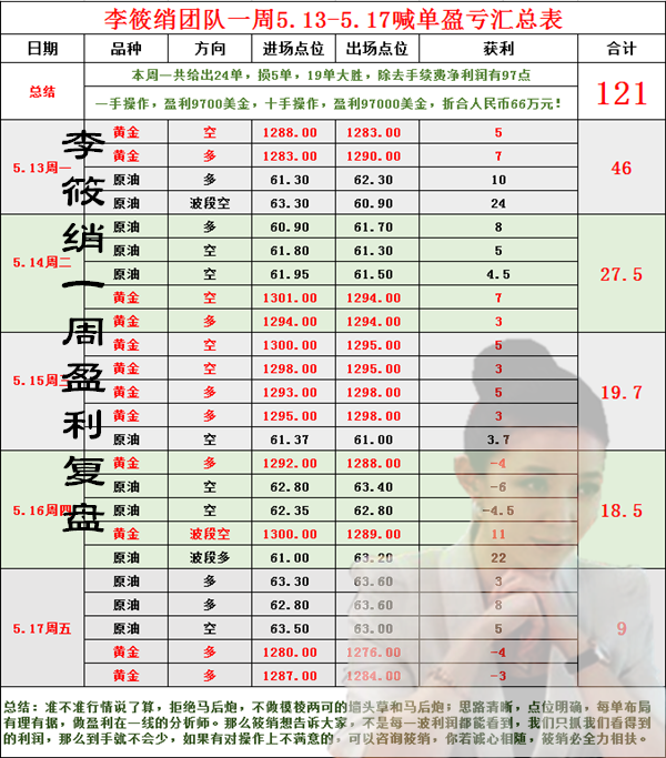李筱绡5.18:黄金原油一周盈利统计;121点净赚66万独步天下! 读万卷书不如行万里路,行万里路不如阅人无数,阅人无数不如名家指路,名家指路不如筱绡带路,我依然是那个低调又有实力的李筱绡。 李筱绡一周操作回顾—----运筹帷幄之中,决胜千里之外--- 口说无凭,李筱绡只用事实说话,从上周末开始,李筱绡撰文给大家分析了本周行情趋势,一路劈荆斩棘,给了你无数的机会却跟不上我连续止盈的节奏。 你日夜操守,熬夜盯盘,无非就是想在这个交易市场收获利润,可奈何盈利却遥遥无期,究其原因,还是缺乏技术、盲目无知、匮乏经验。 周五 黄金波动反常,1280关键支撑破位,你还在一路加仓多,筱绡早