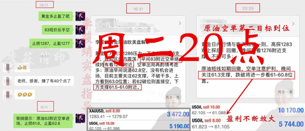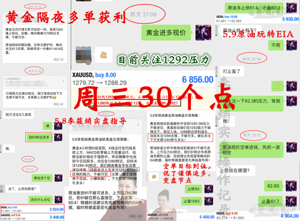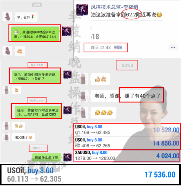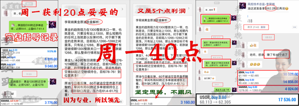 李筱绡5.14:黄金原油最新交易计划!精准现价单日获50万全网验证! 读万卷书不如行万里路,行万里路不如阅人无数,阅人无数不如名家指路,名家指 路不如筱绡带路,我依然是那个低调又有实力的李筱绡。 ----运筹帷幄之中,决胜千里之外--- 交易回顾截止目前本周我们一共交投23单,无一损单,盈利23单,总盈利点数158,净盈利点数135,100%的胜率。本周和上周的交投我们可以看出,本周我们又增加了几个波段油的单子,所以利润空间比较大。 日月如梭,在过去的一周时间里筱绡在这个市场上所向披靡,豪取160点利润有余,可以说是完美至极,可是有些人却不同,在这一周的时间里过的浑浑噩噩,不知道
